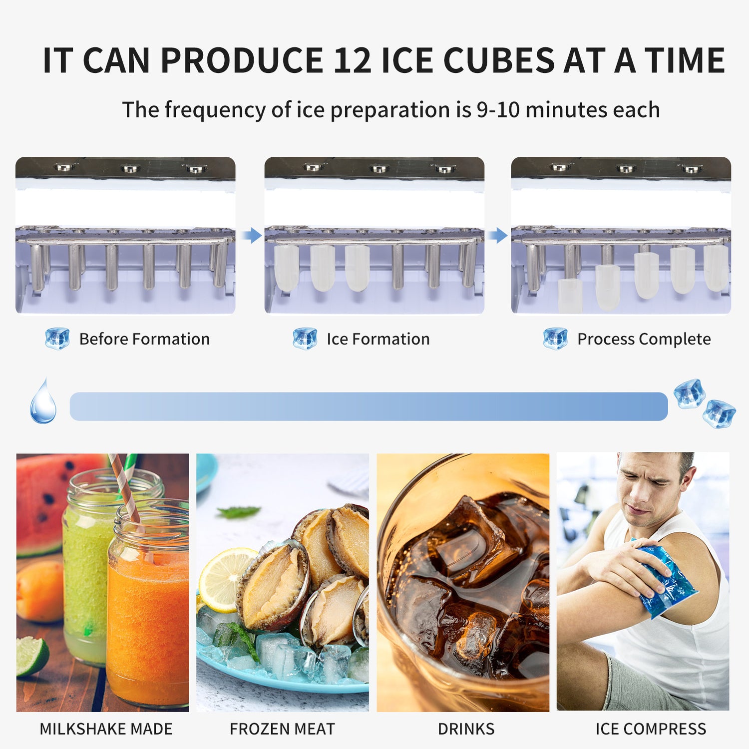 1. High-Quality Ice Cubes Countertop ice maker machine can produce 12 ice cubes per cycle (every 9-10 minutes). That means you can make up to 44 pounds of ice cubes every 24 hours. Best of all, you can adjust the thickness of the ice cubes according to your needs, letting you create perfect drinks to impress your family, friends and coworkers!