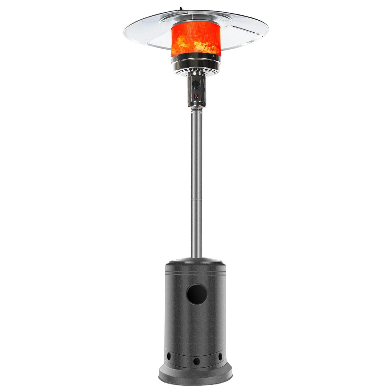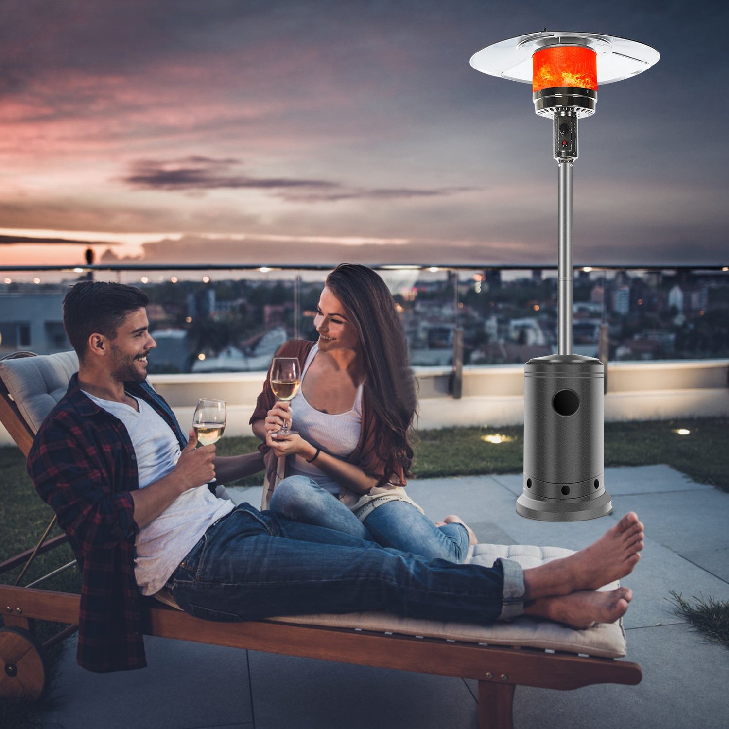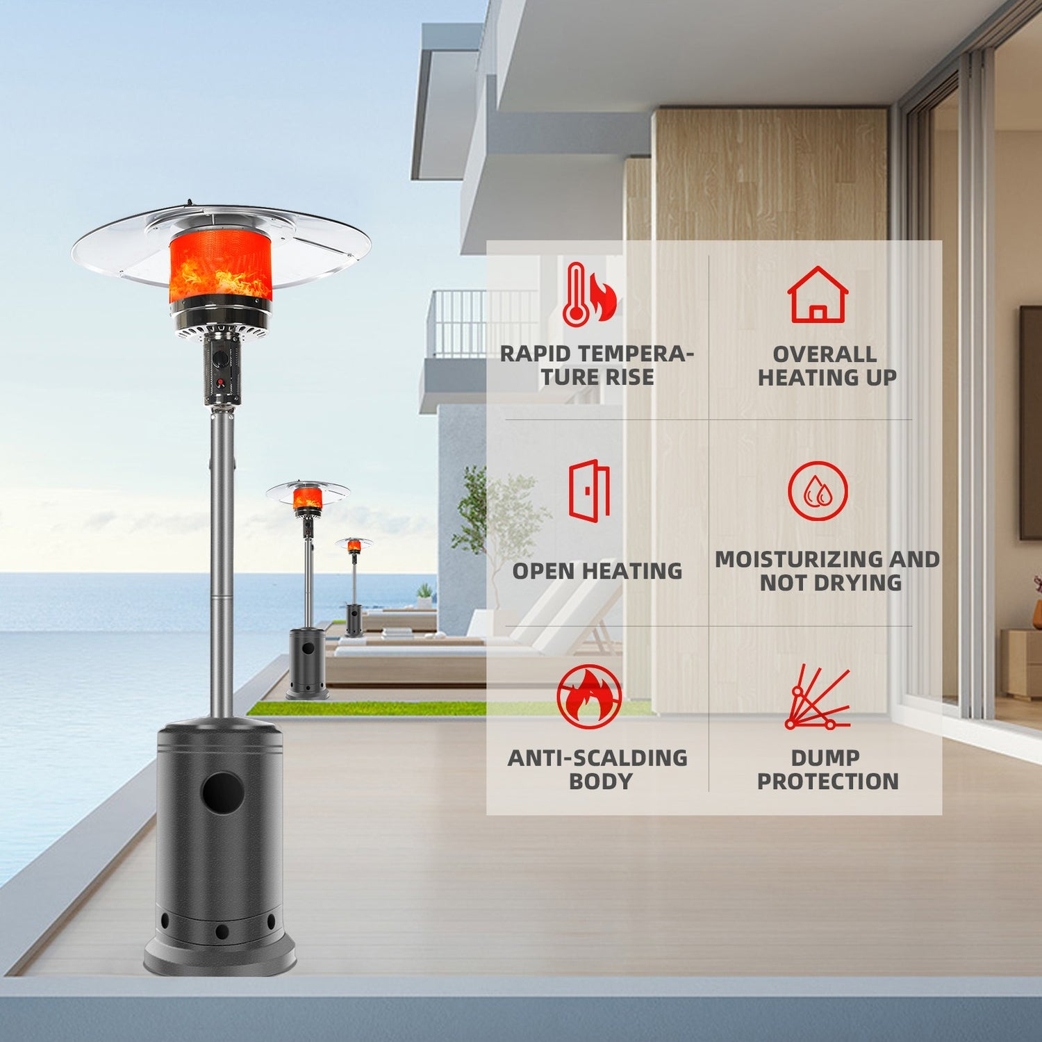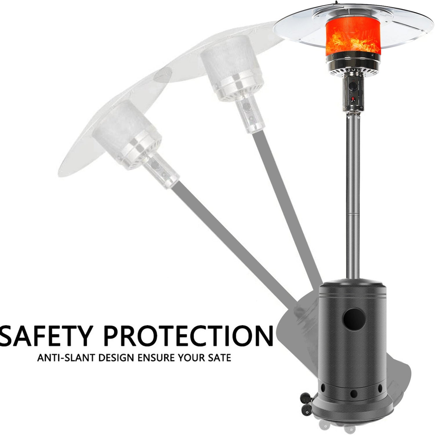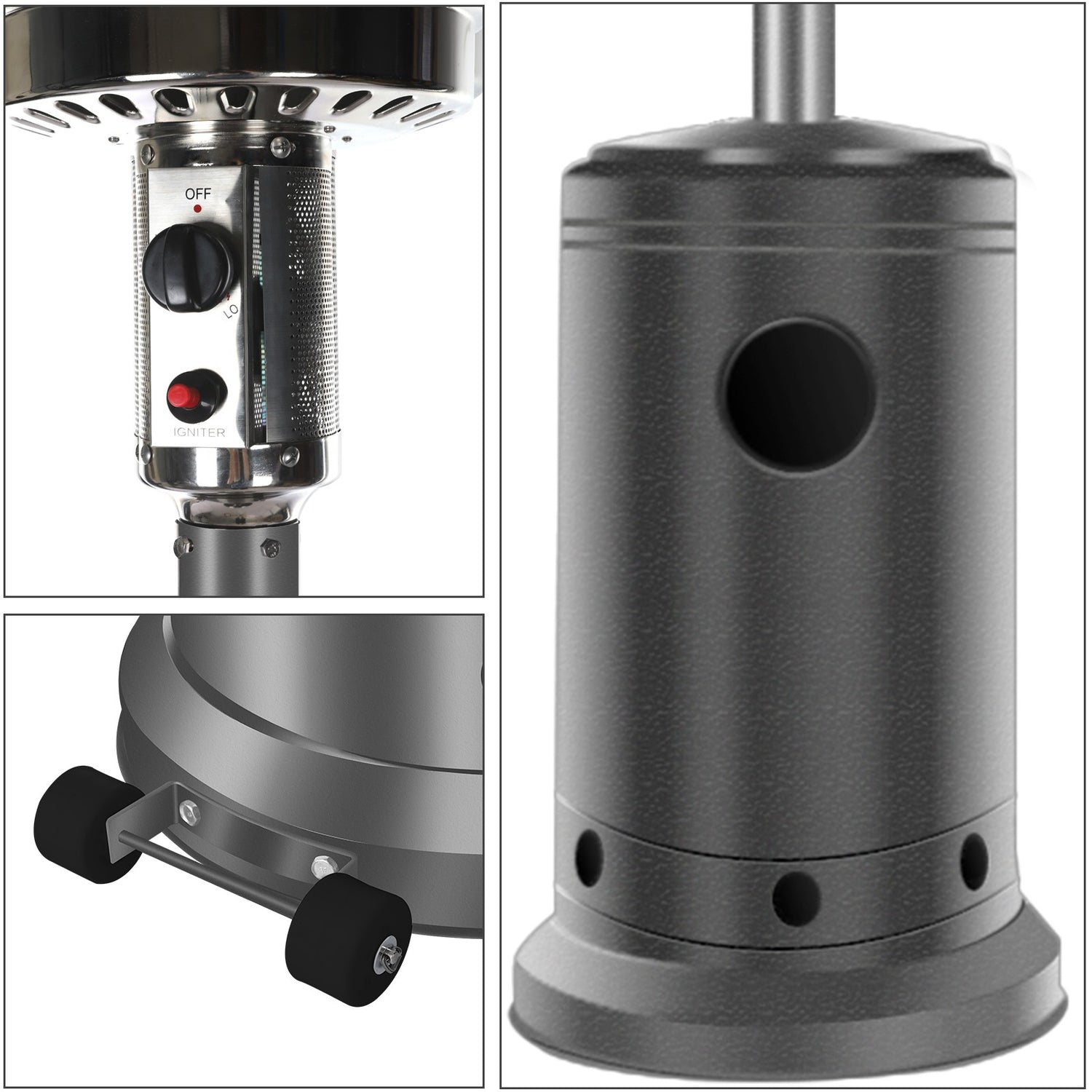 Wheels for Smooth Mobility :A wheel assembly with two smooth-rolling wheels comes included, making it easy to transport the outdoor heater from poolside to patio or from one side of the deck to the other; Heat Output: 46,000 BTU; Heat Range: 10m(32.8' Radius)