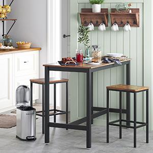 - A Set for Demanding Ones: A bar table and 2 bar stools with high-quality rustic brown finish—a wonderful addition to your kitchen, game room, or living room. The black steel frame not only forms an appealing contrast to the wood tone, but also serves as a practical footrest